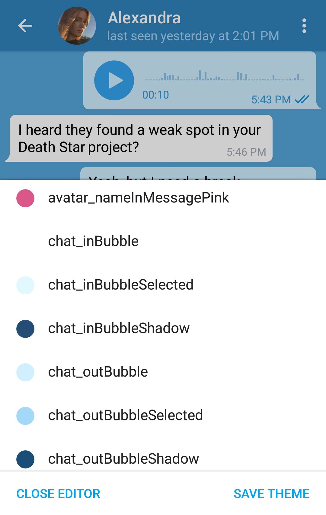 To switch to a different theme or create a new one, go to Settings > Theme. We‘ve included a Dark Theme in that menu for those of you who don’t want to use Telegram as a flashlight in dark places.