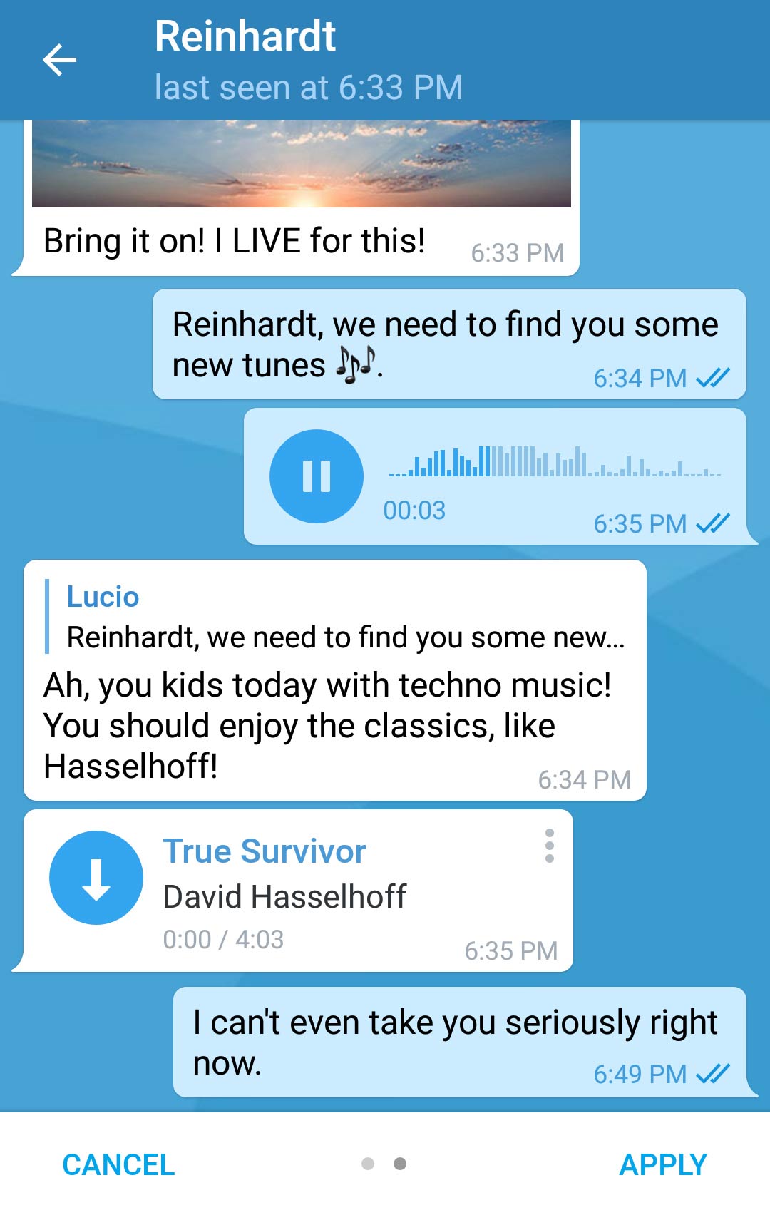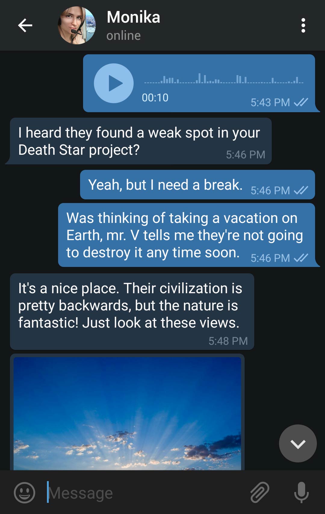 Just like stickers and bots, Telegram themes are part of an open platform, so anybody can create a theme and dazzle the world with new colors and backgrounds. Here's another example of a theme created by our users: