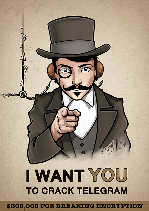 Earlier this year we had a contest to decipher intercepted Telegram messages, that did not produce a winner. Today we announce a new contest with an easier task and a larger prize — $300,000 for cracking Telegram's encryption, and this time contestants can not only monitor traffic, but also act as the Telegram server and use active attacks, which vastly increases their capabilities.