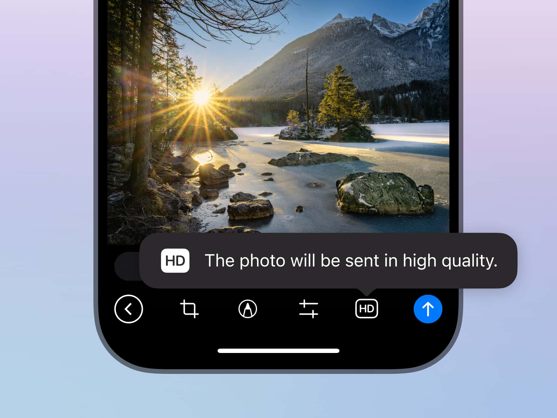 To send an image in HD, tap the SD button in the photo editor or select 'Send In High Quality' via the attachment menu.