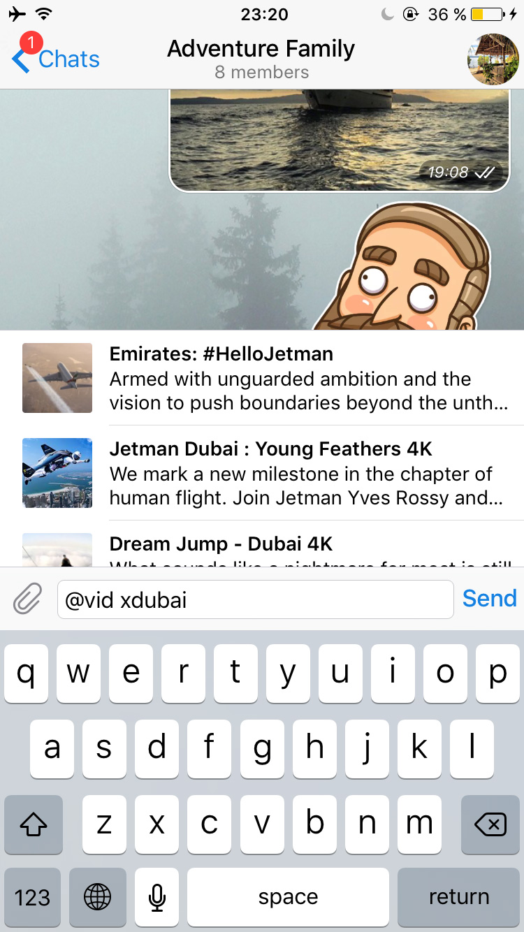 Tap on an item to instantly send it to the chat. This way you can share stuff from bots without any hassle. Inline bots don't see any messages in your chats – they only receive what you type after their username in the input field.